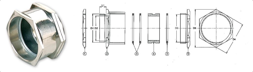 | Suitable Cable. Overall Dia. (mm) | D1 Nipple Entry | D2 | D3 | D4 A/F | D5 A/C | L1 Length | Product Code | |