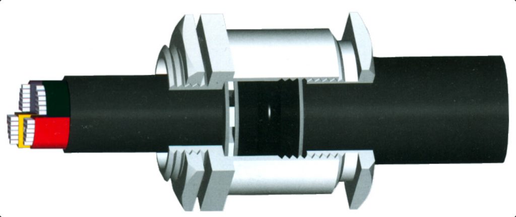 e) Push the cable through item 2 and screw the item 5 into item 2. While doing so, the grooved rubber ring will contract in a radial direction and will grip the outer sheath of the cable.